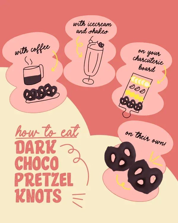 Crunchy pretzel knots dipped in rich dark chocolate for the ultimate sweet-salty snack. Bite-sized, shareable, and made with quality ingredients—perfect with coffee, tea, or wine.