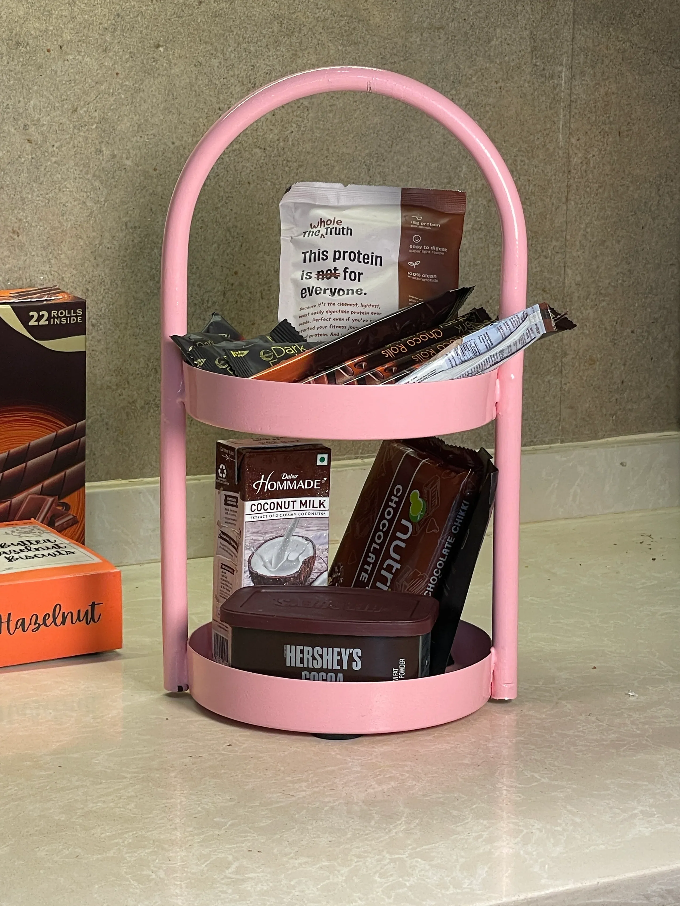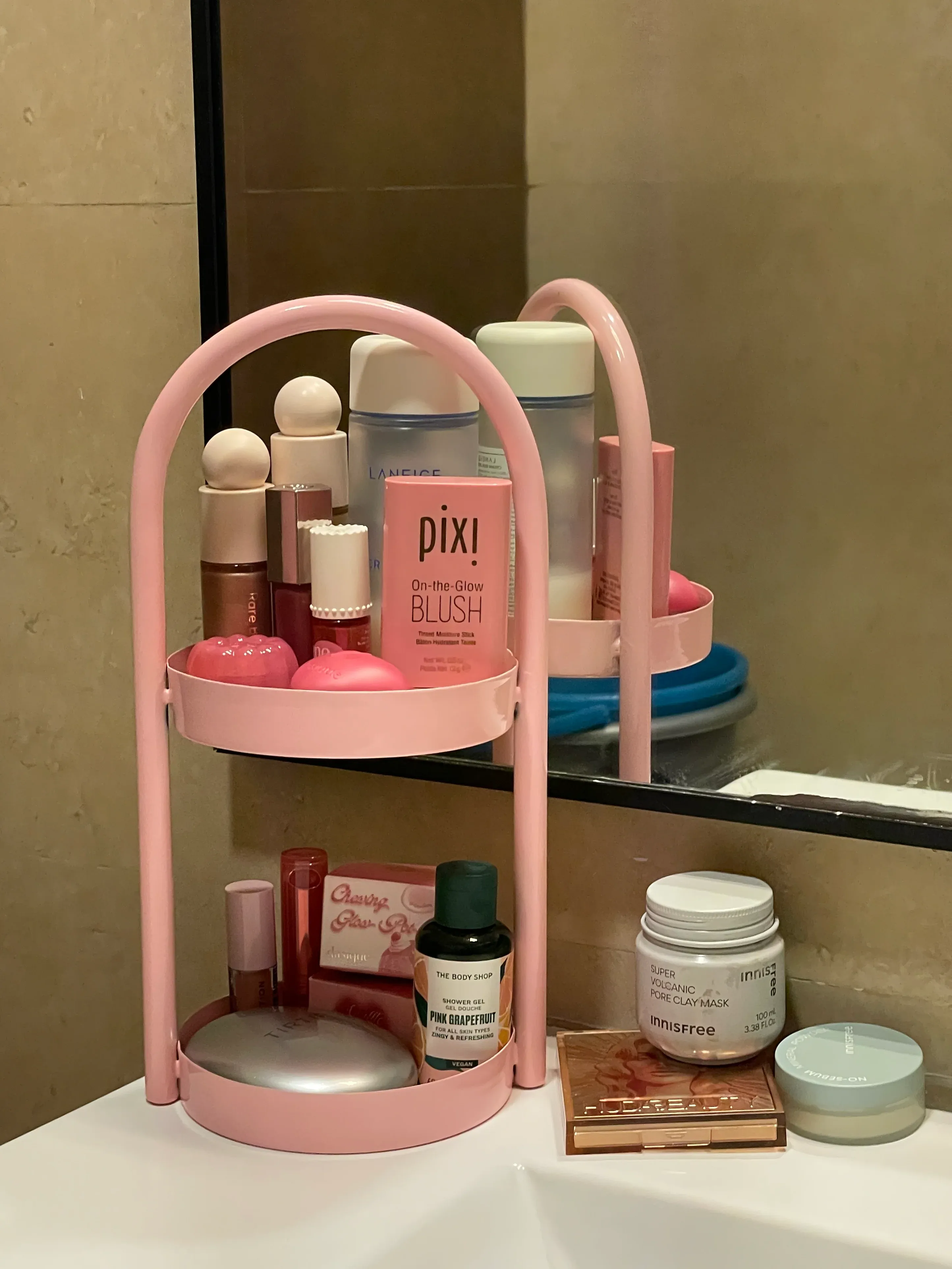 Overview: The cuter way to declutter. Meet your new everyday essential — the KeepAll Caddy. Whether it’s skincare, makeup, perfumes, or even desk supplies, this two-tier caddy carries it all with ease and elegance. Crafted in a soft blush powder-coated metal, it’s sturdy, stylish, and super functional.