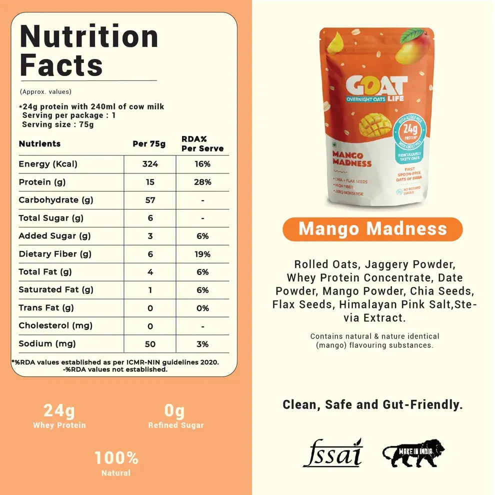 Tropical taste meets serious fuel. Crafted with real Alphonso mango and 24g whey-based protein, Mango Madness delivers a delicious, nutrient-packed breakfast that powers your day - naturally and guilt-free.