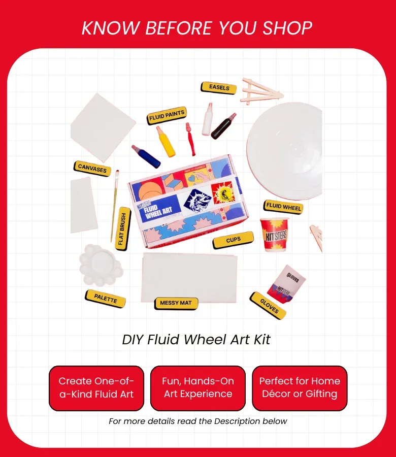Overview: Create mesmerizing, custom artwork with the DIY Fluid Wheel Art Kit! This kit lets you craft your own unique fluid art using centrifugal motion, resulting in vibrant, abstract designs that are truly one-of-a-kind. Perfect for adding a bold, artistic flair to any room, each piece is a dynamic blend of color and movement. Ideal for beginners and seasoned creatives alike, this kit offers a fun, hands-on way to explore fluid art and express your creativity.