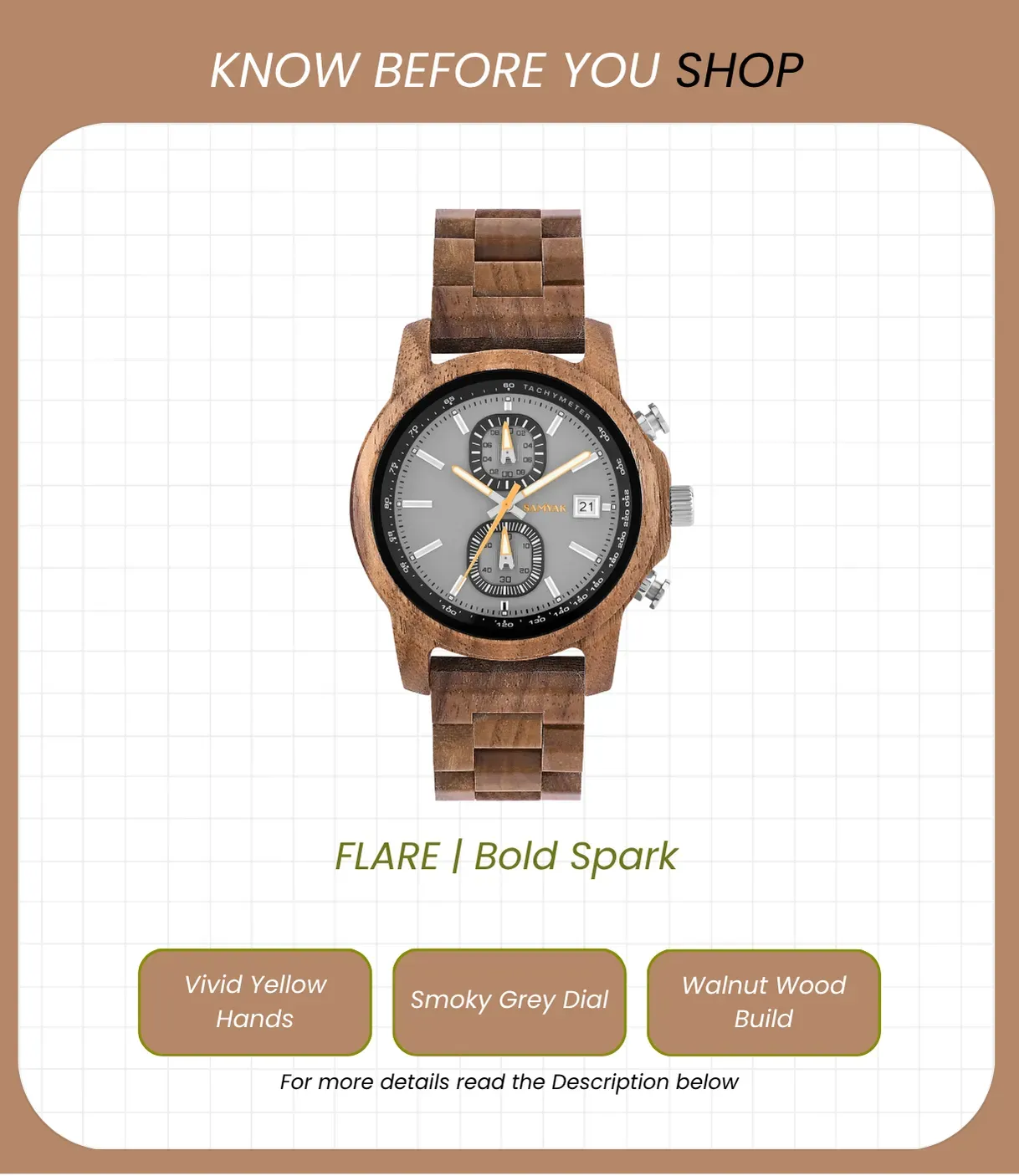 The Bold Spark watch blends natural walnut wood with a smoky grey dial for a striking aesthetic. Featuring durable Hardlex mirror and powered by automatic movement, it embodies boldness and reliability. With 3 ATM daily water resistance, it’s designed for everyday wear without compromise.