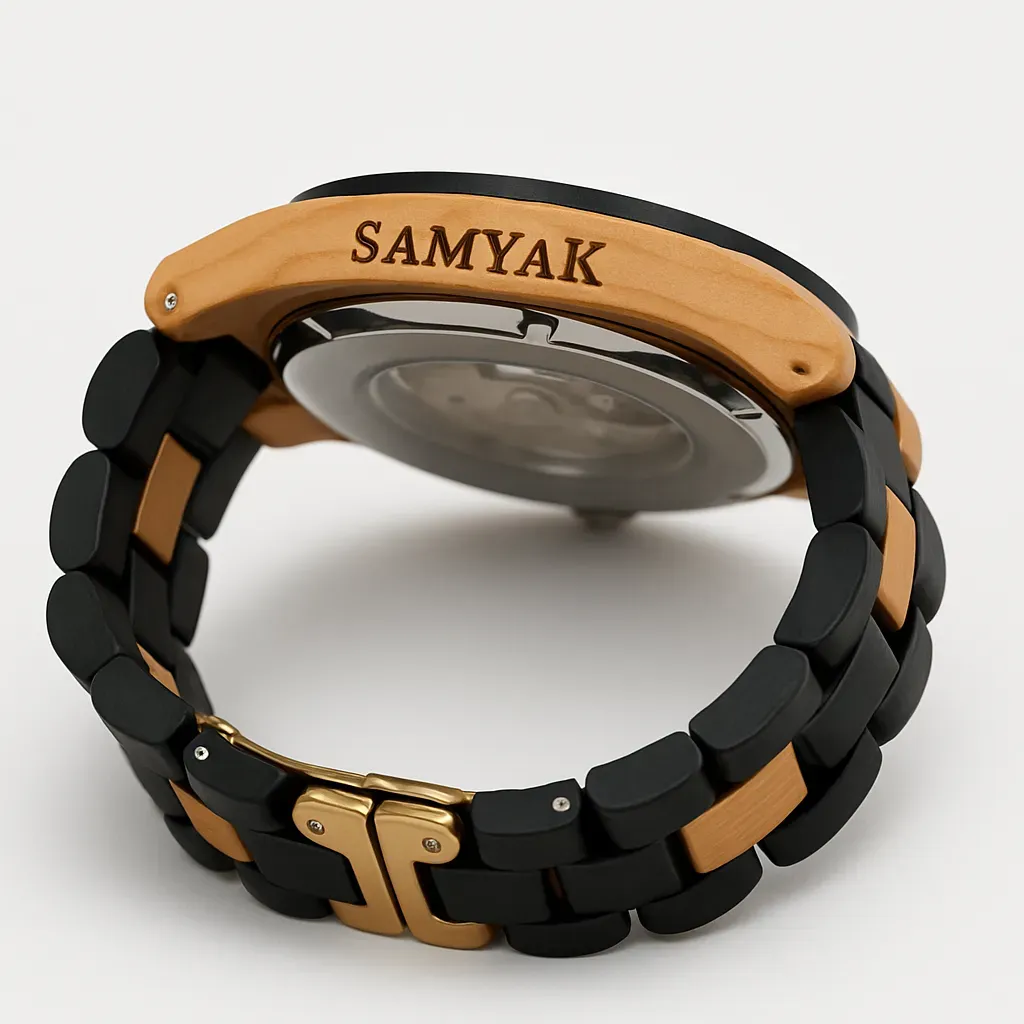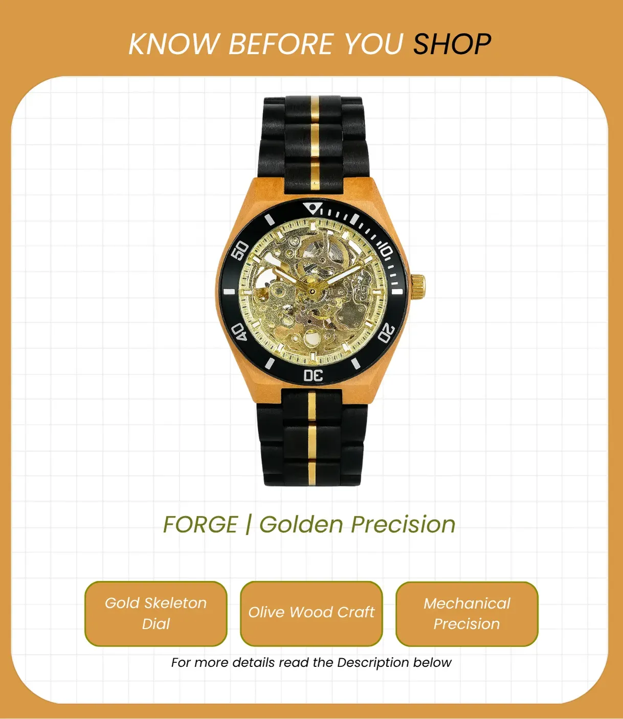 The FORGE Golden Precision combines natural olive wood with stainless steel for durability and elegance. Its skeleton dial reveals the quality mechanical movement inside, making every detail visible. With black accents and a bold design, this watch embodies both luxury and resilience. Its 3 ATM water resistance ensures everyday practicality.