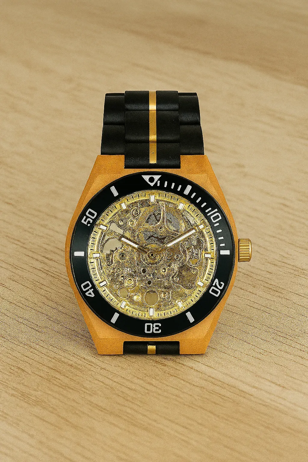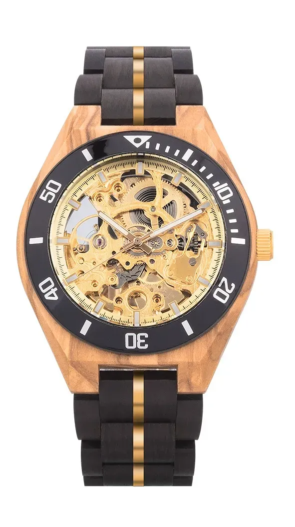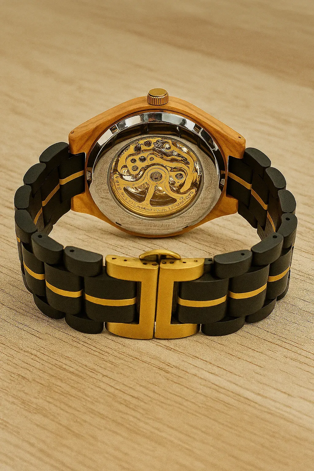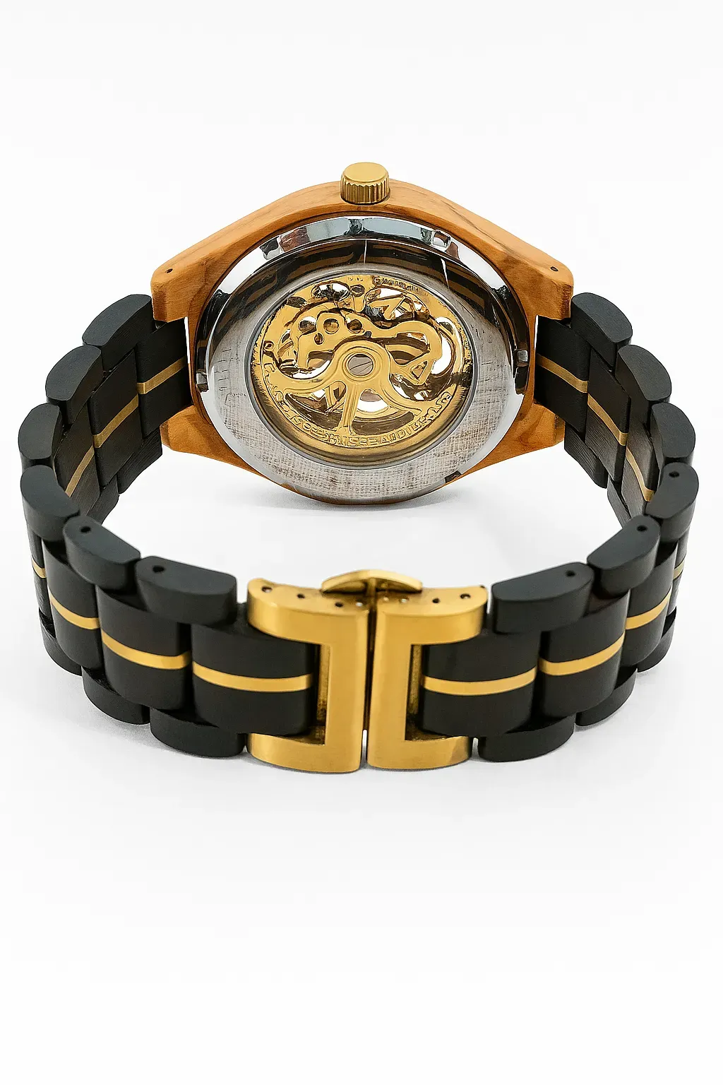 Forge blends olive wood, black accents, and a radiant gold skeleton dial. Its open design showcases every gear in motion — a refined display of strength, precision, and style.