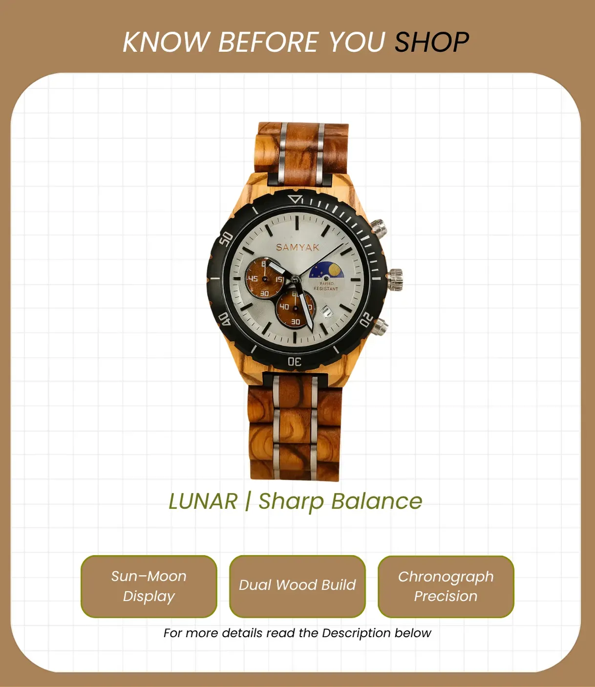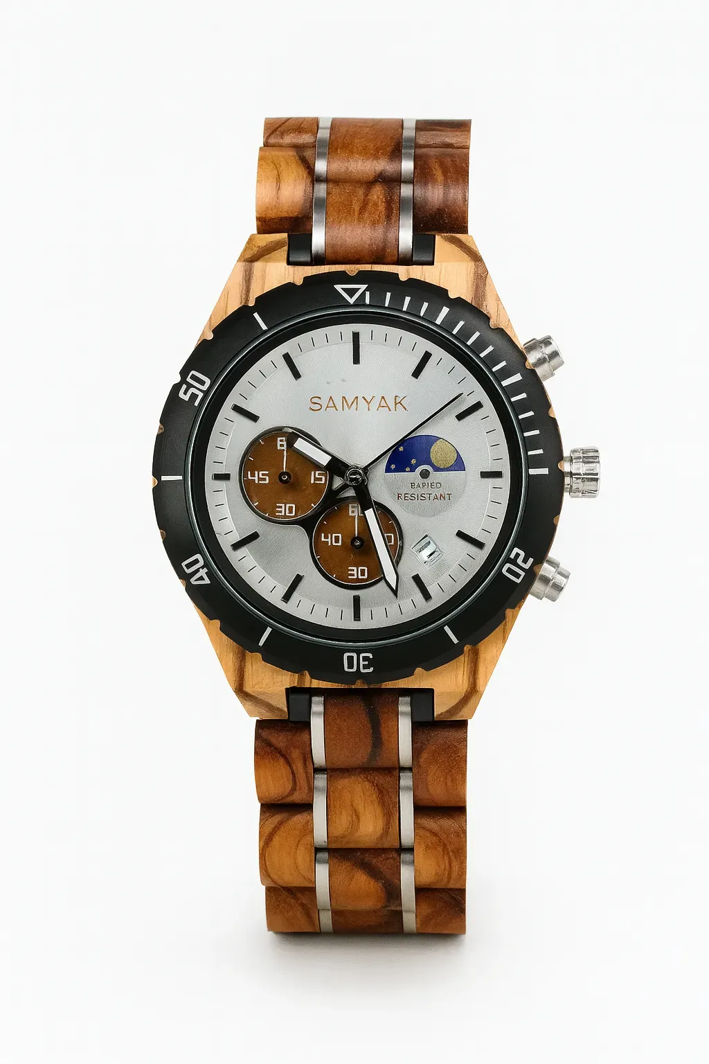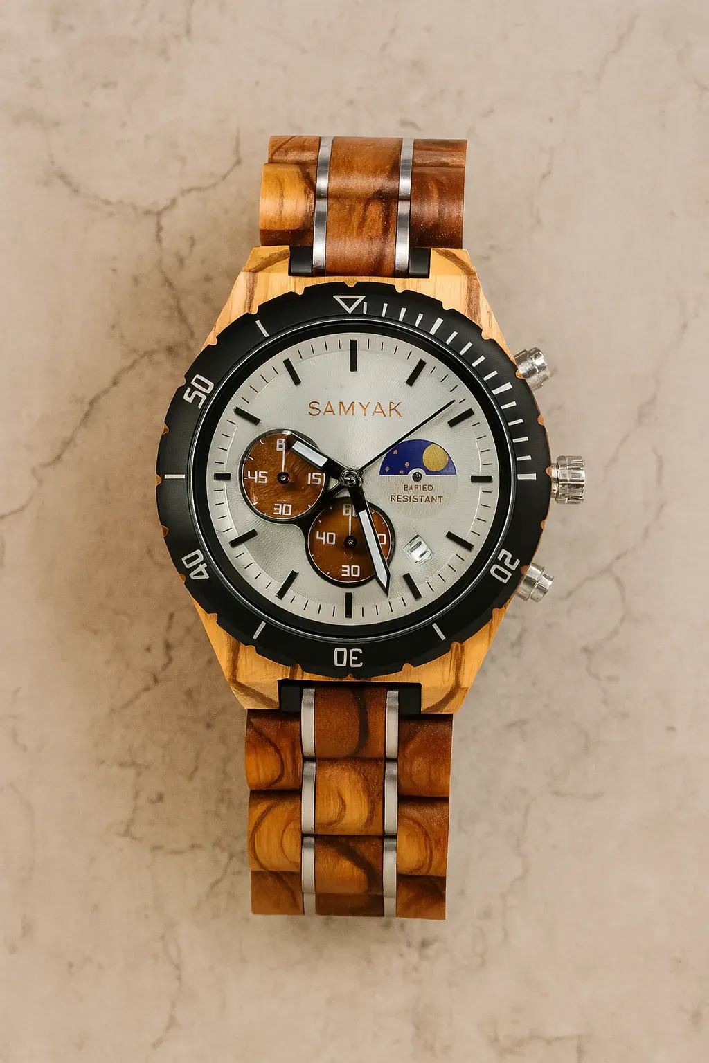 Lunar combines light zebra wood with rich red sandalwood, sleek steel accents, and a bold black bezel. With its chronograph sub-dials and a stunning sun–moon phase, it embodies both precision and style — striking the perfect balance of adventure and elegance.