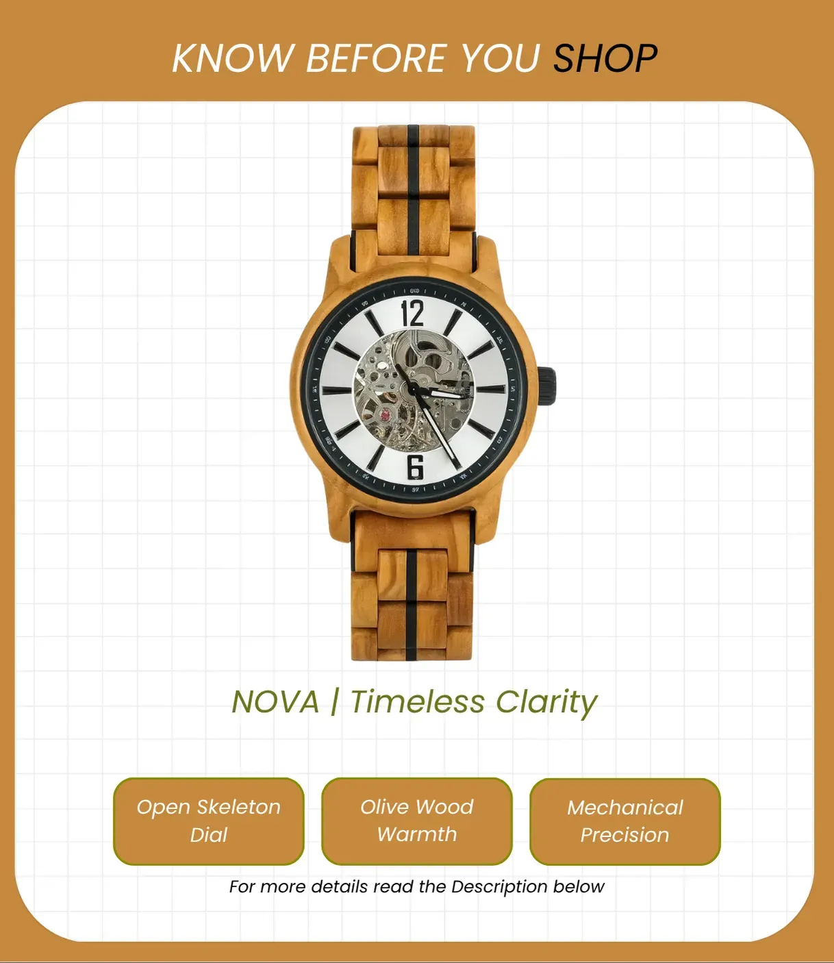 The NOVA Timeless Clarity blends Hardlex, olive wood, and stainless steel for a refined balance of durability and natural warmth. Its open skeleton dial showcases the intricate mechanical movement inside, creating a watch that is as much a work of art as it is a timepiece. With 3 ATM water resistance, it is crafted for both sophistication and everyday use.