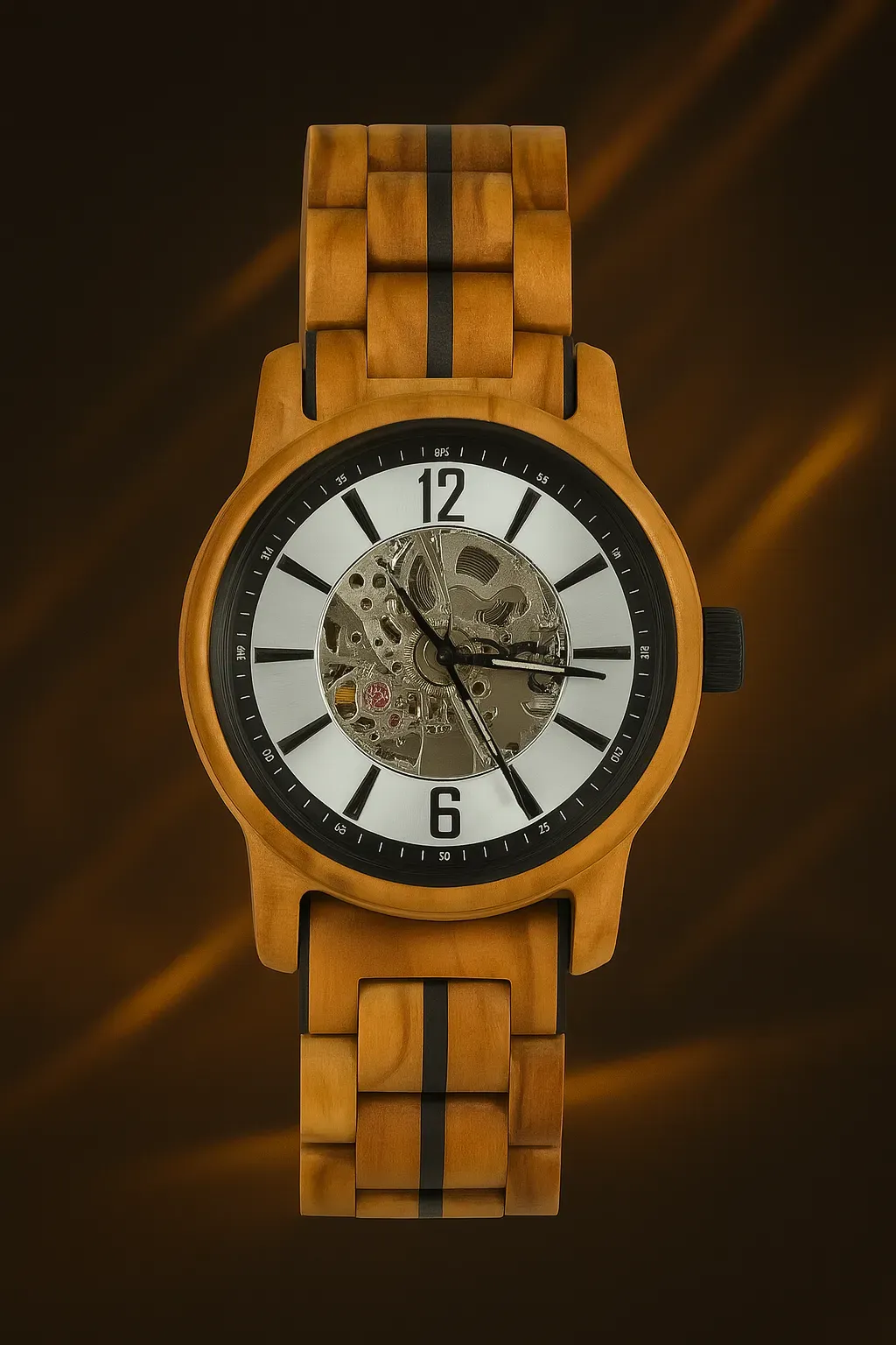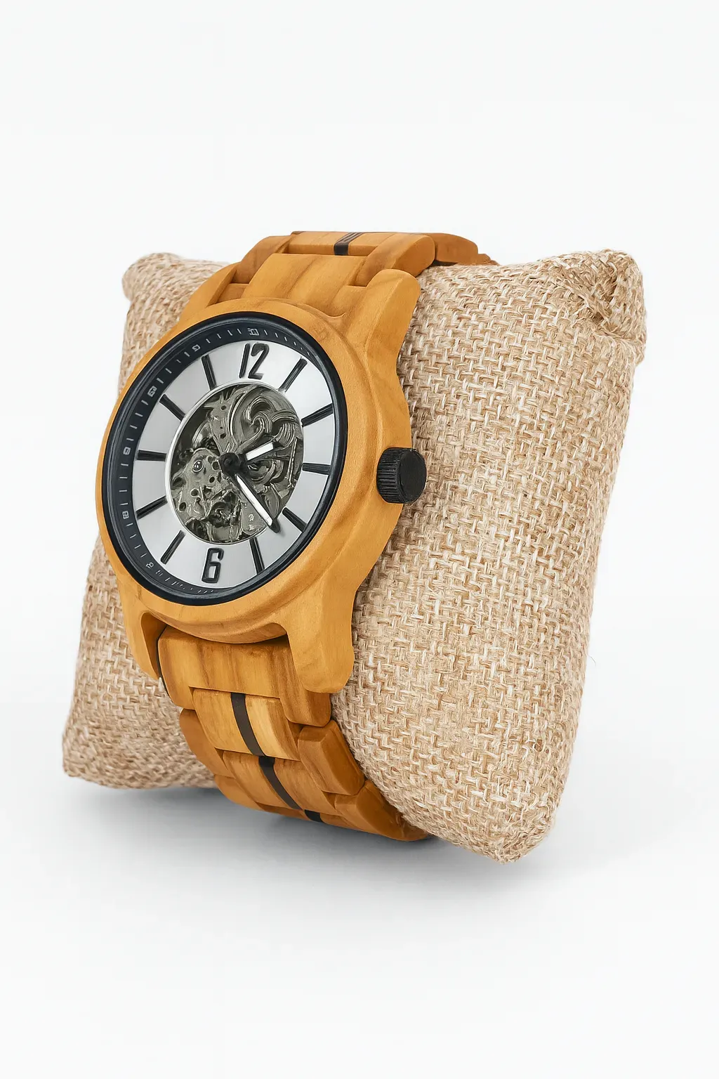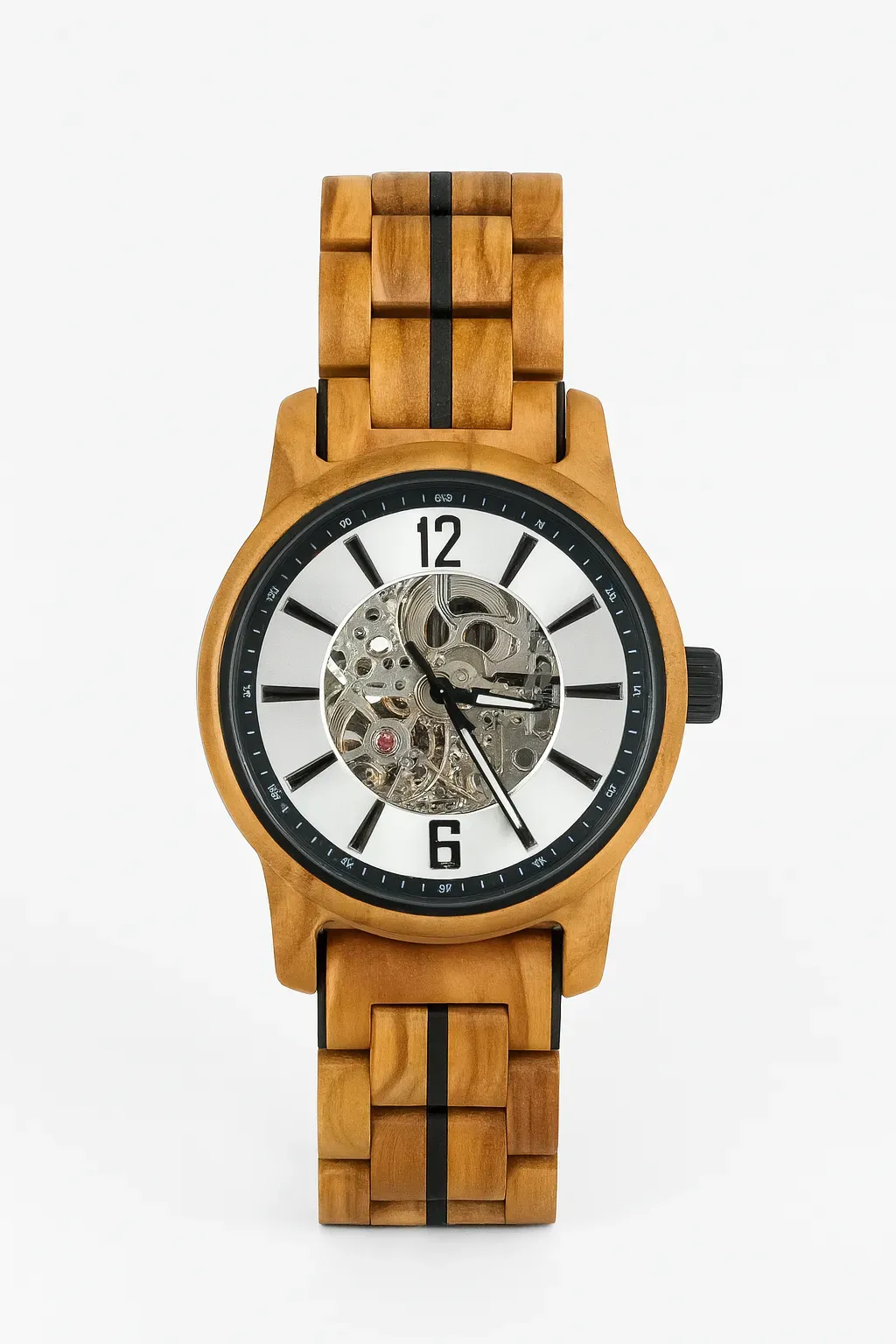 A refined skeleton dial watch blending olive wood and stainless steel — Nova showcases every gear in motion with elegance and precision.