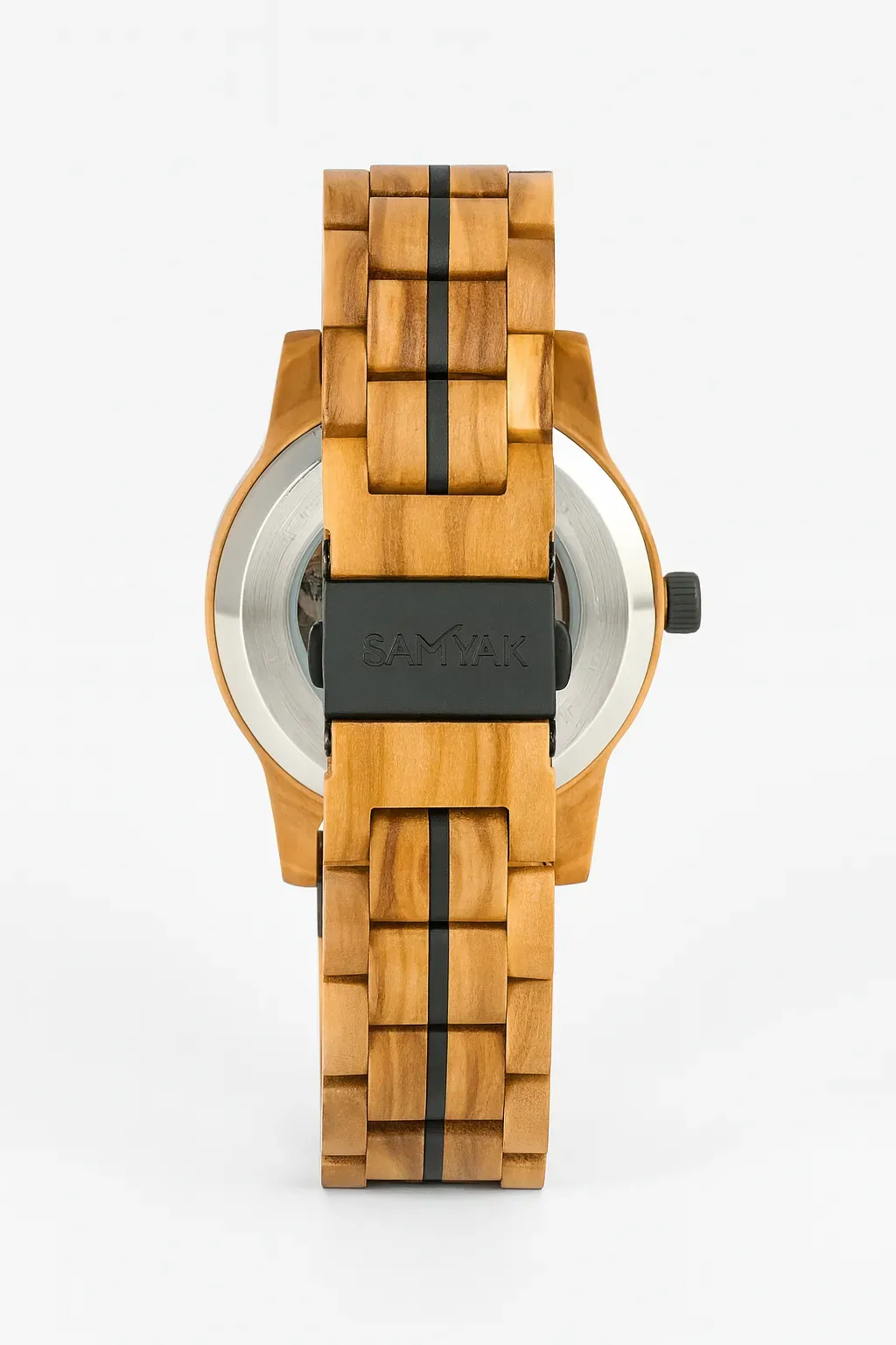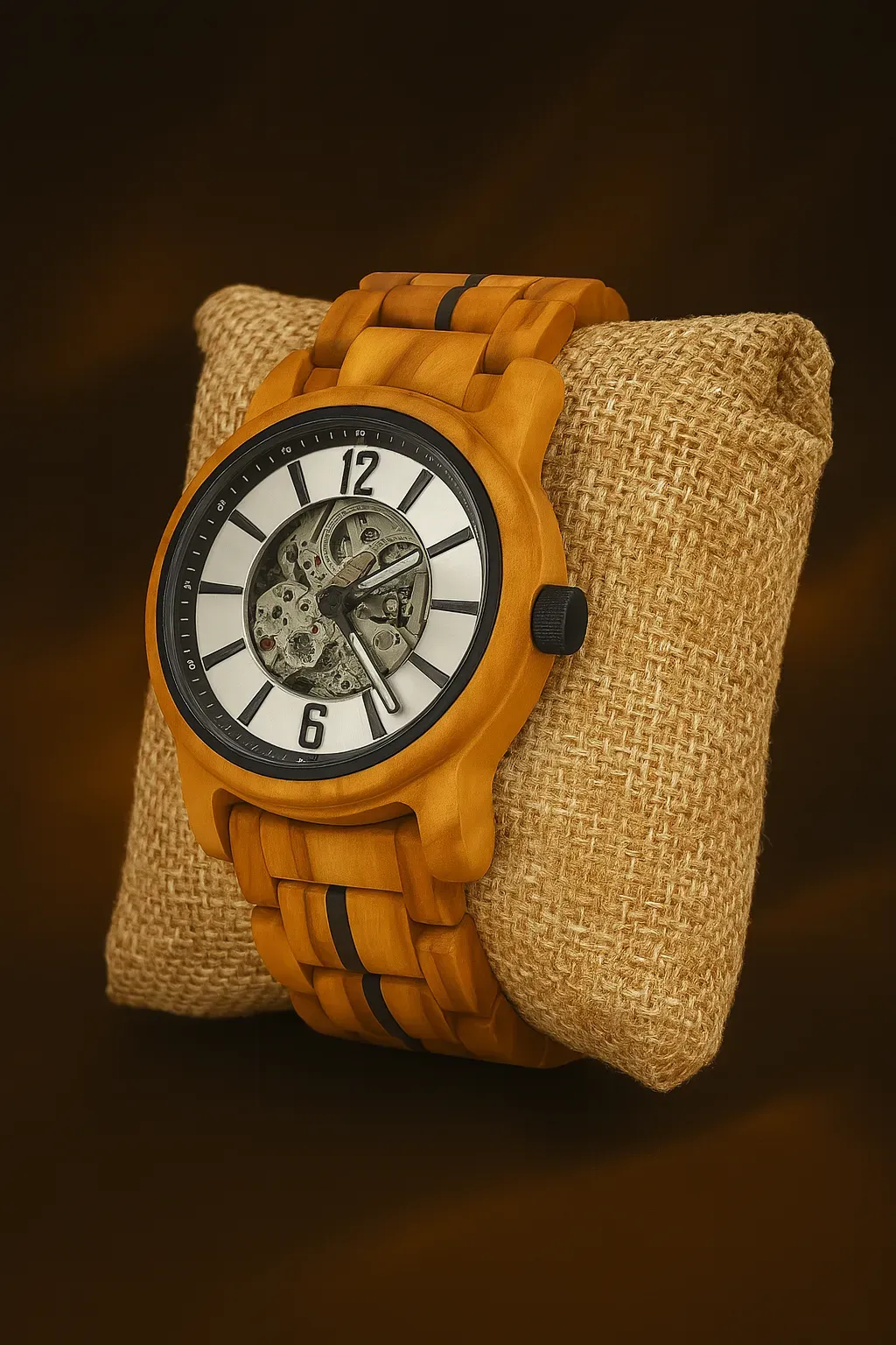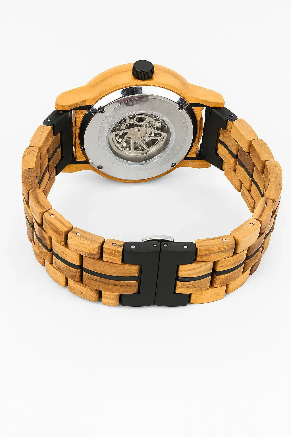A refined skeleton dial watch blending olive wood and stainless steel — Nova showcases every gear in motion with elegance and precision.