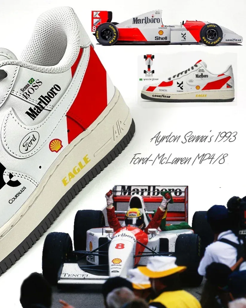 A bold Ayrton Senna x McLaren inspired take on the iconic Nike Air Force 1, designed for racing fans who want to wear motorsport heritage on the streets.