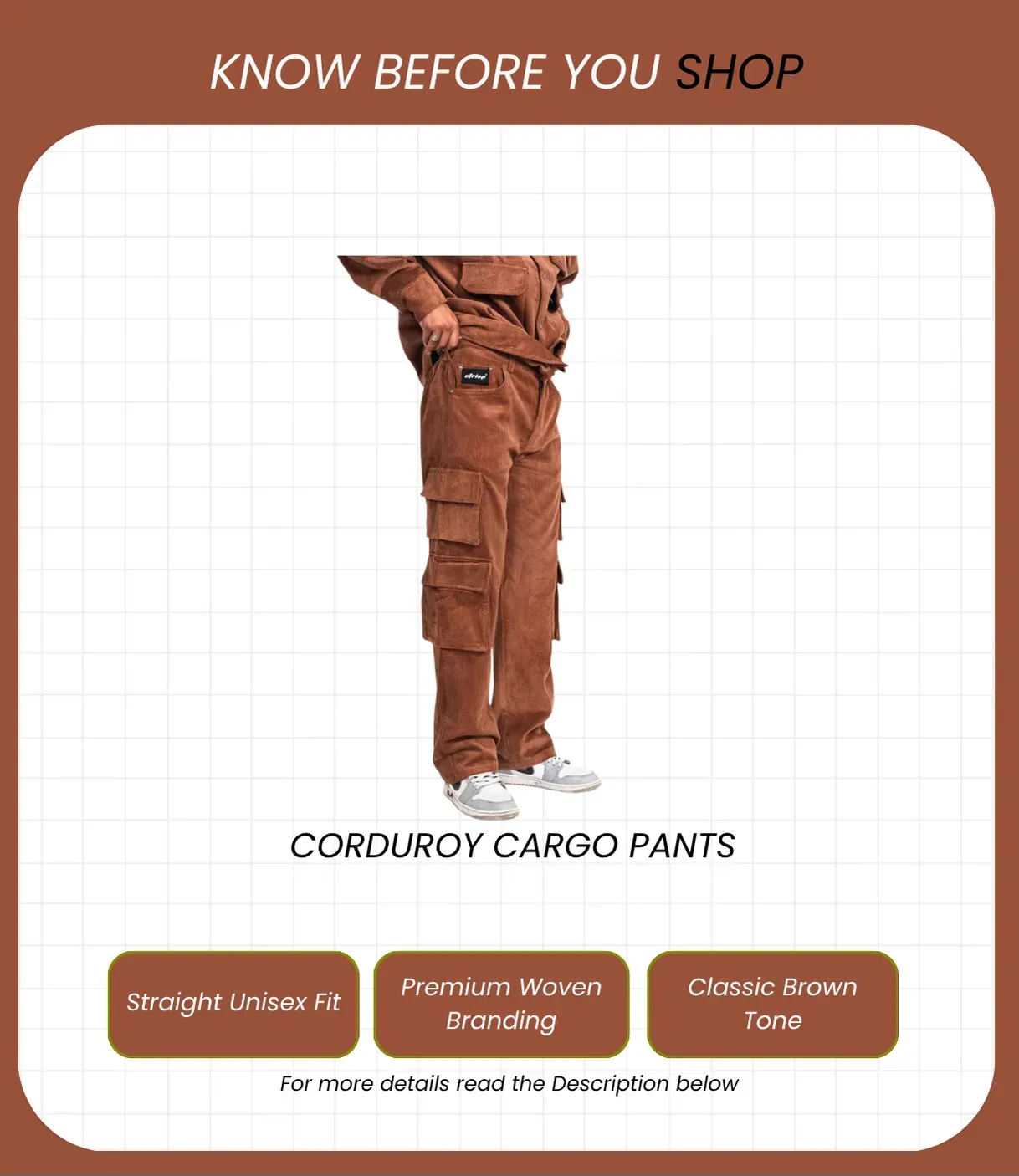Introducing our Corduroy Cargo Pants crafted with a substantial 300 GSM weight for the perfect balance of durability and comfort. Designed in a straight fit with rich brown corduroy, they feature cargo styling with woven label branding, making them a versatile staple for any wardrobe.