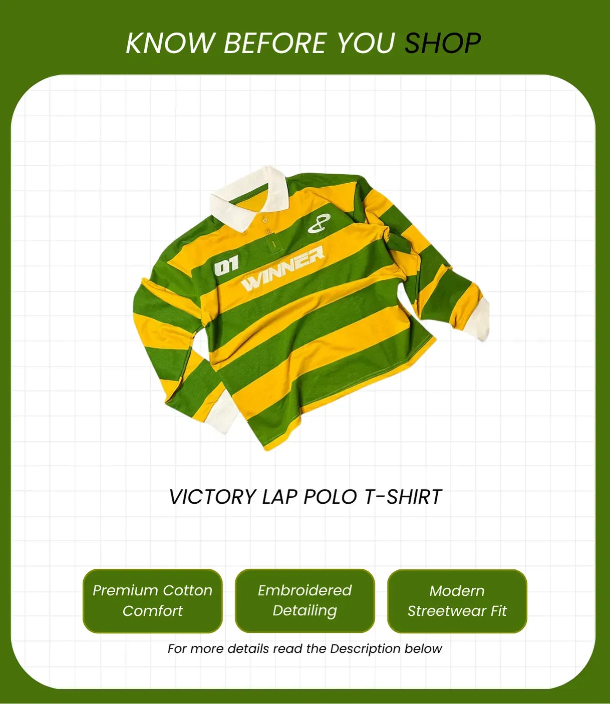 The Victory Lap Polo T-Shirt blends the bold attitude of classic rugby polos with elevated Ctrl+P craftsmanship. With its embroidered "WINNER" and "01" graphics paired with a signature brand logo, this long-sleeve polo stands out as a premium, versatile piece for every streetwear wardrobe.