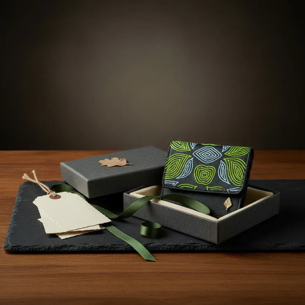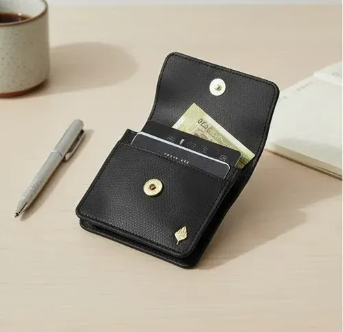 A sleek Lana Black vegan card holder crafted from plant leather and cork, designed to keep your essentials neatly organised in a slim, modern form.