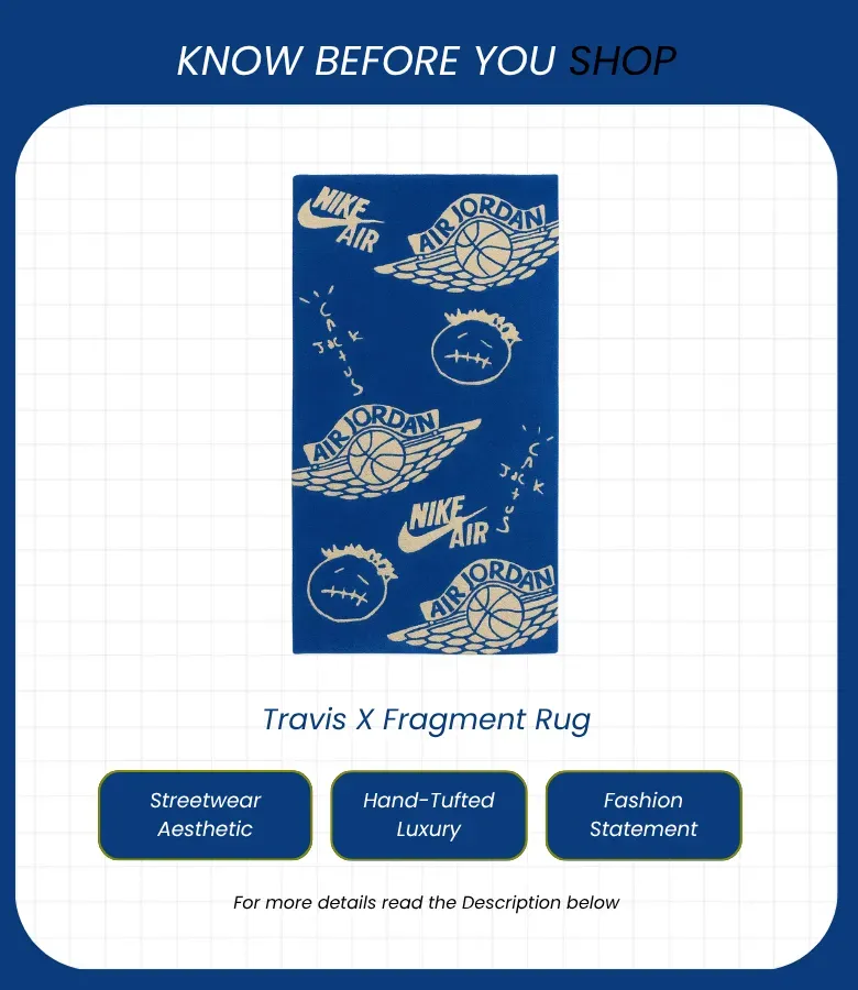 Show off your style with the Travis X Fragment Rug. It features cool designs from the Travis Scott collection, making it a trendy and eye-catching addition to your room. Perfect for fans of modern fashion.