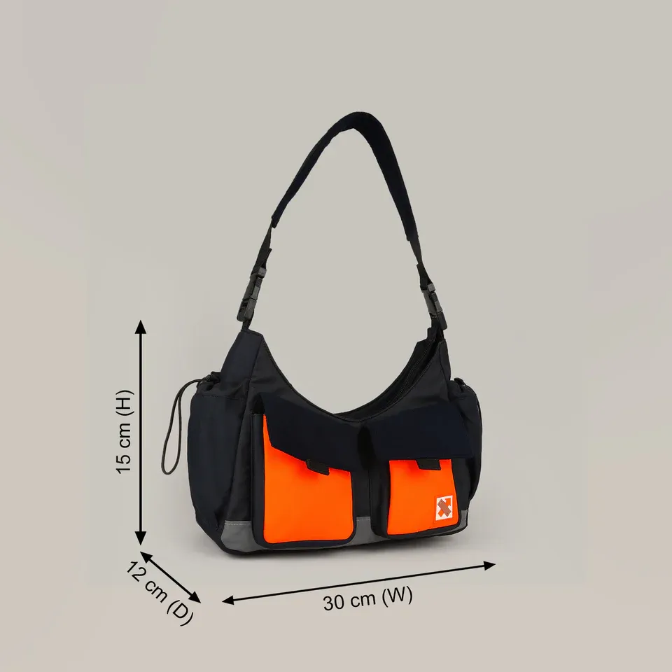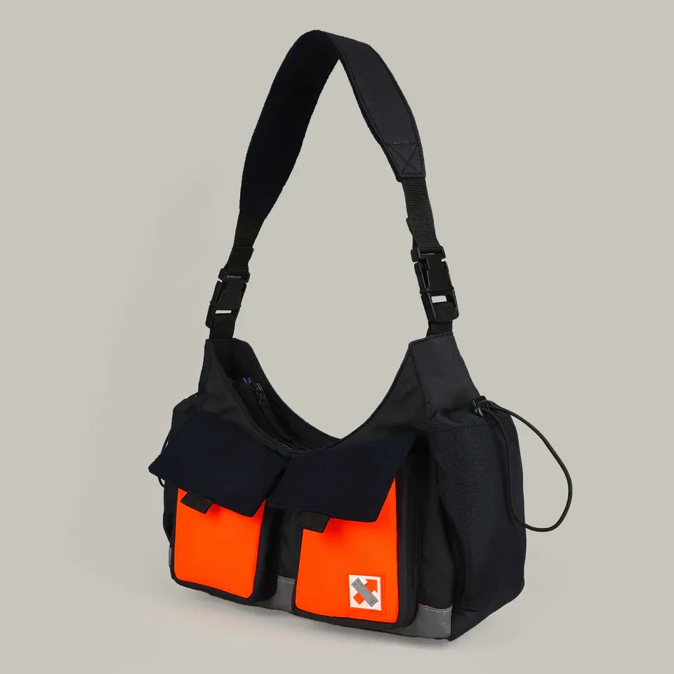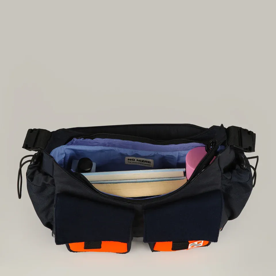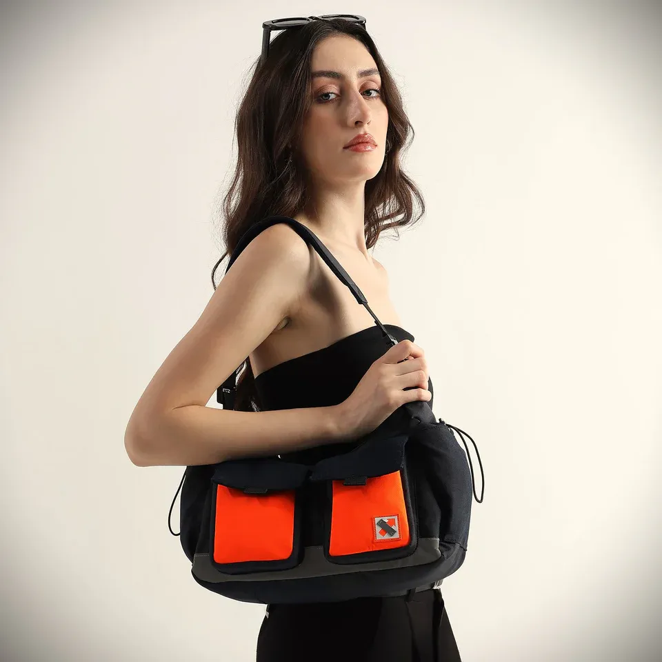 Meet the Strobe Dual Handle Bag (Navy) - upcycled from pre-loved workwear. With twin front and scrunched side pockets, it keeps essentials handy.
