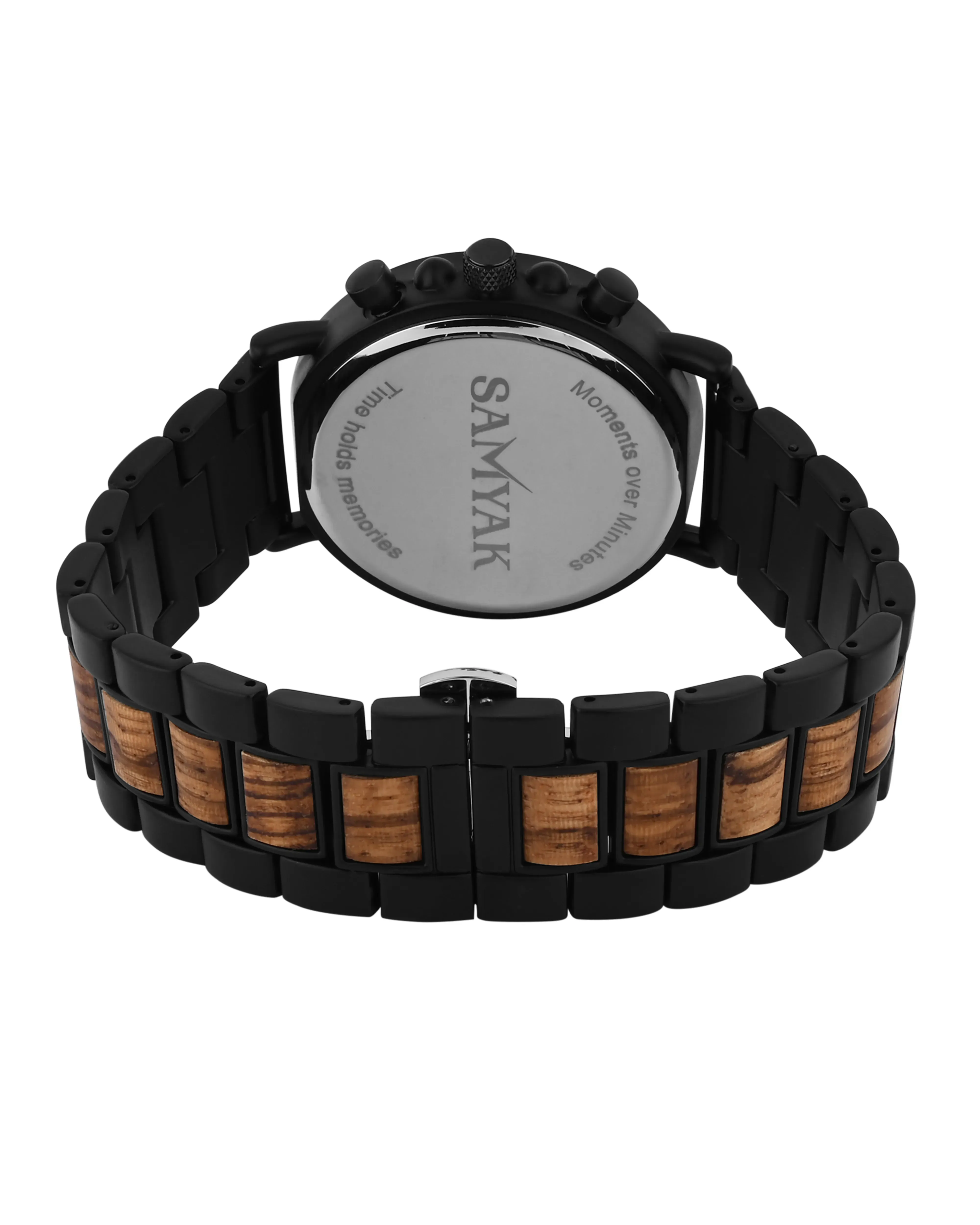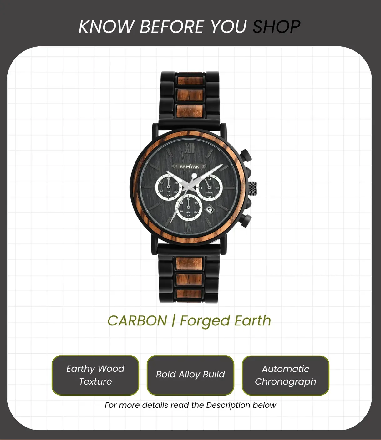 Carbon combines earthy wood textures with modern alloy strength, creating a masculine yet refined chronograph built for timeless appeal.