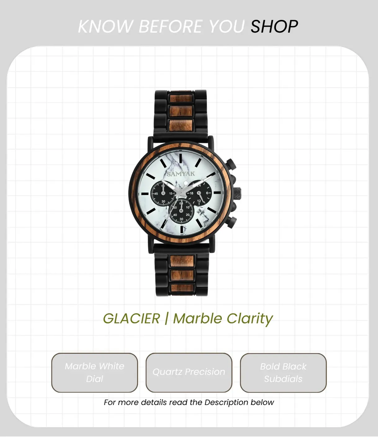 The Glacier Marble Clarity combines natural wooden accents with durable metal casing and a Hardlex mirror for enhanced strength. Powered by quality Quartz movement and supported with 3 ATM daily water resistance, it’s designed for those who appreciate sophistication blended with durability.