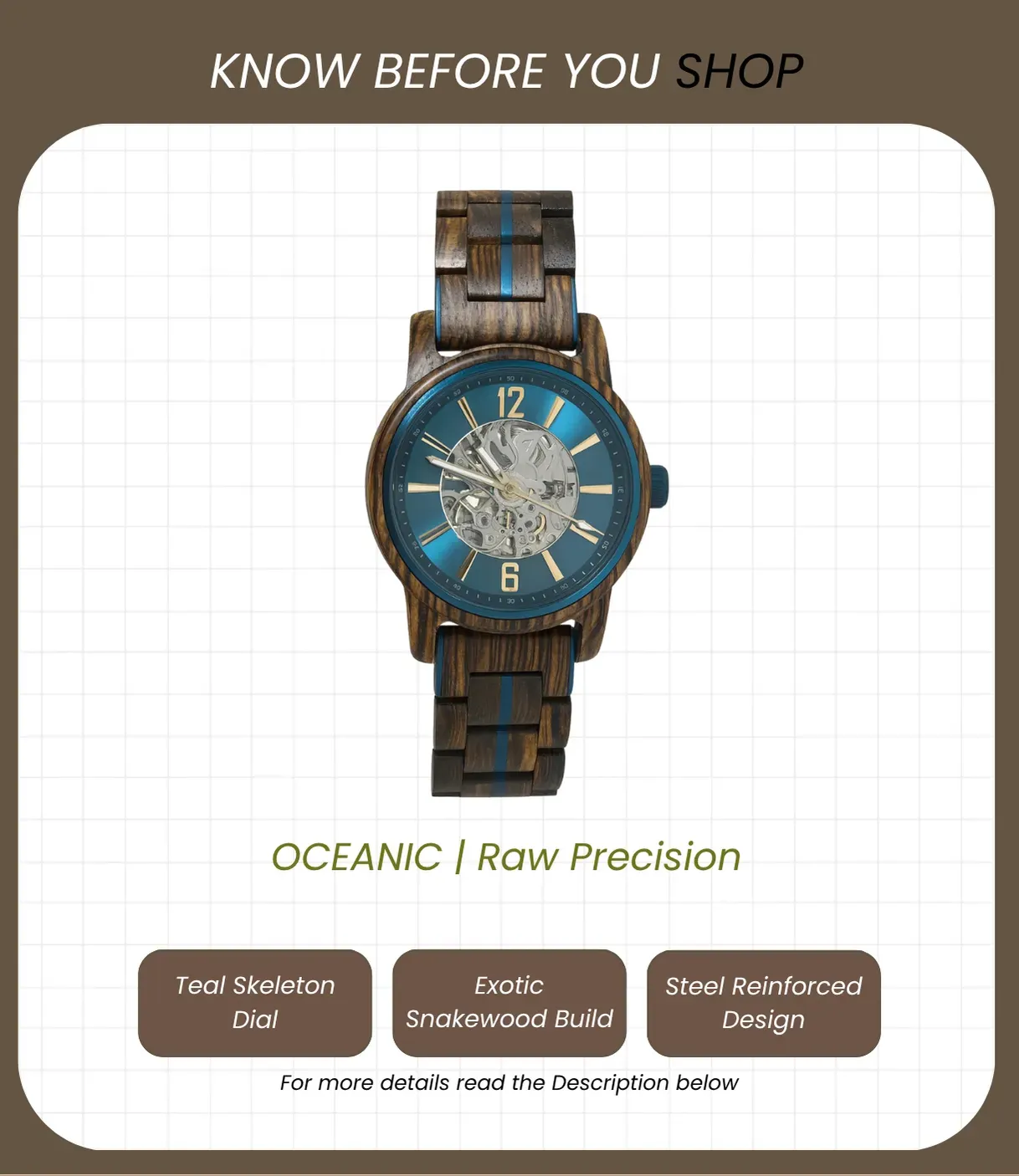 Oceanic blends rich snakewood with a bold teal skeleton dial, revealing the mechanics within. With polished steel accents and transparent detail, it’s a refined statement of strength, precision, and style.