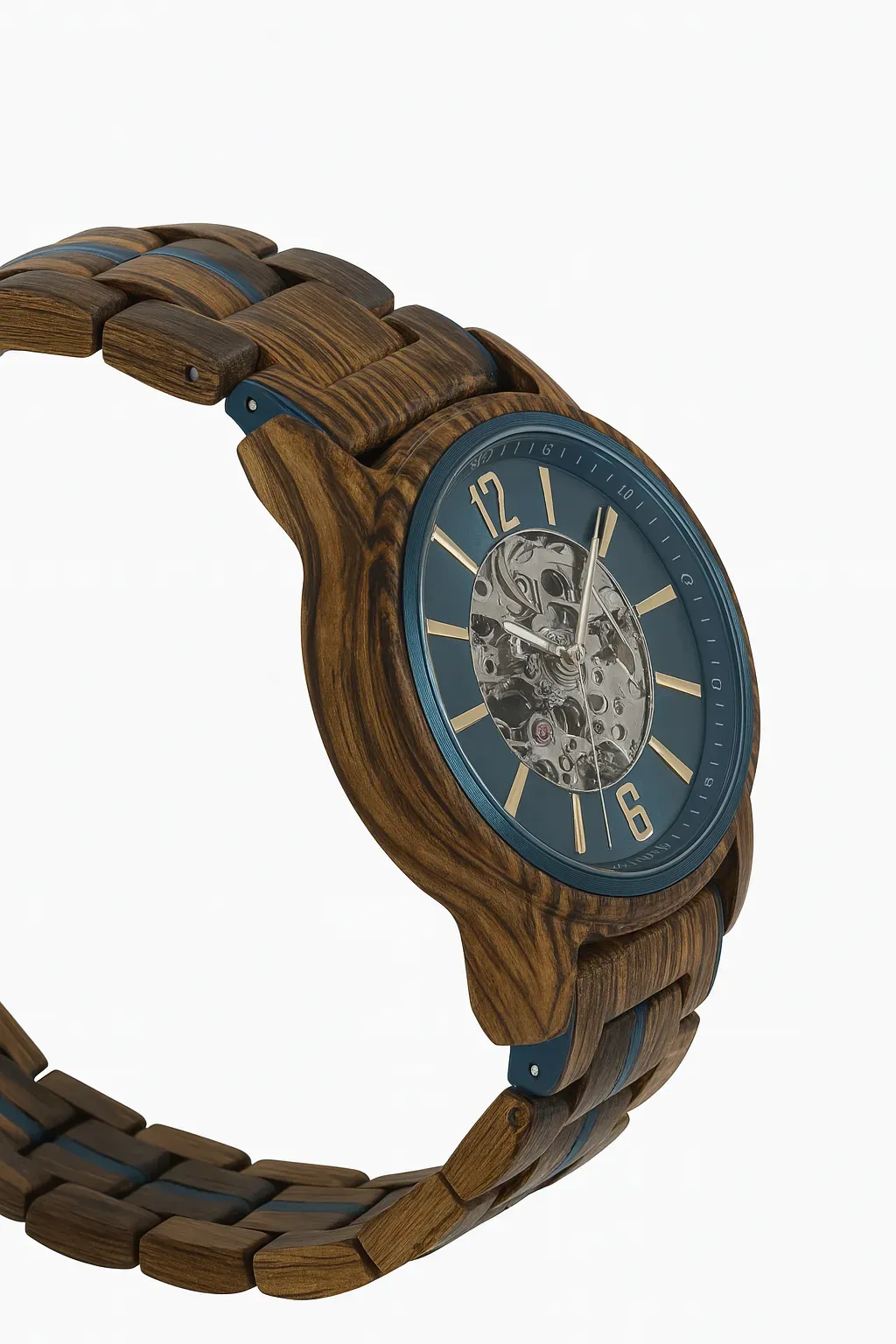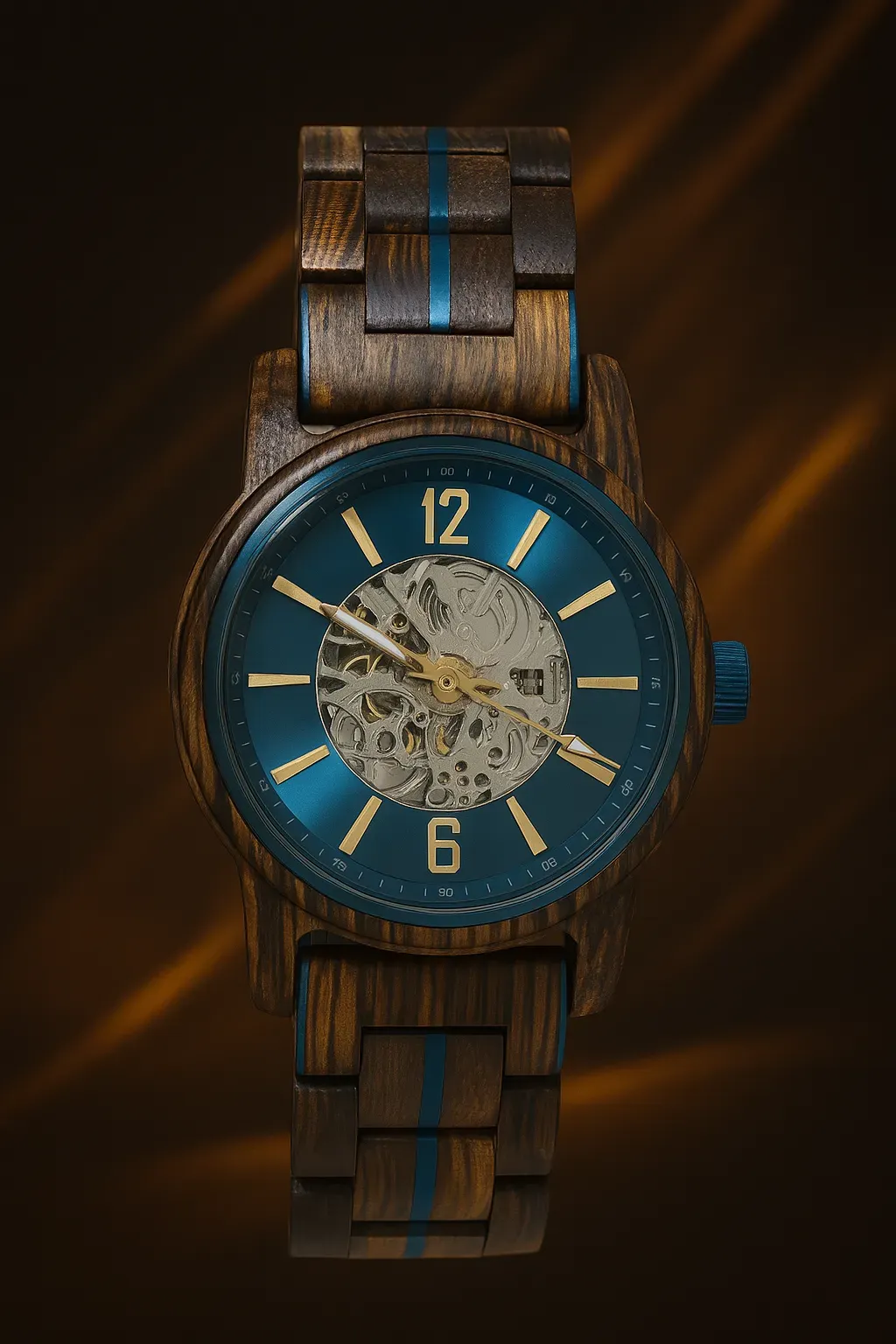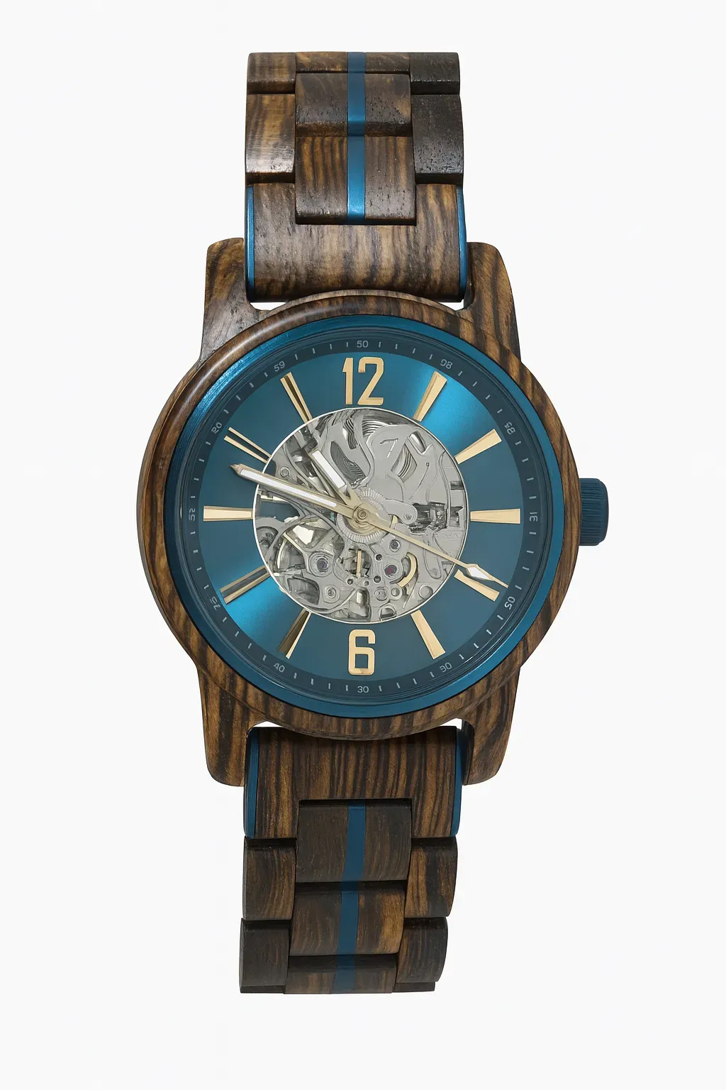 Rich snakewood with a bold teal skeleton dial — refined with polished steel accents and transparent detail.
