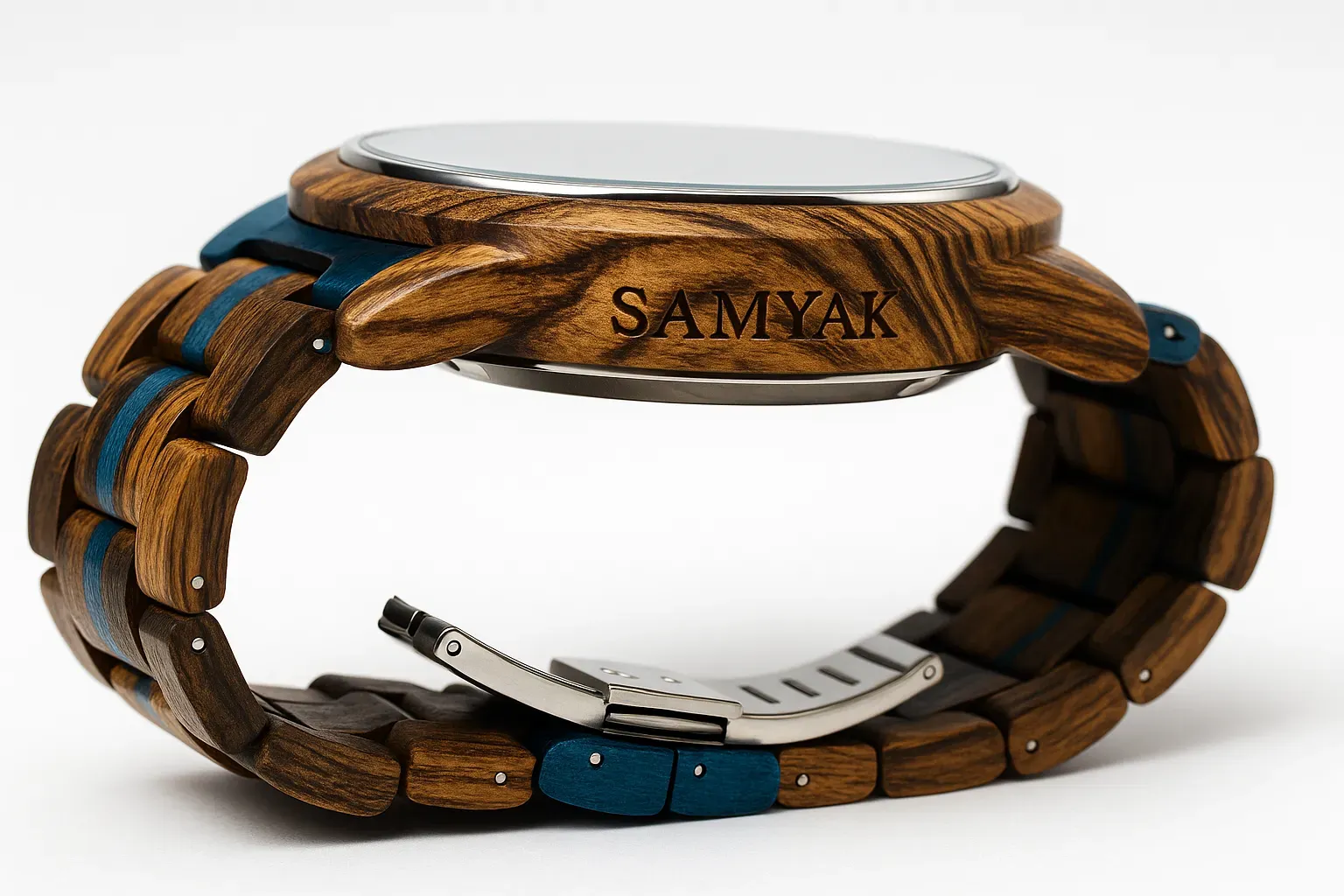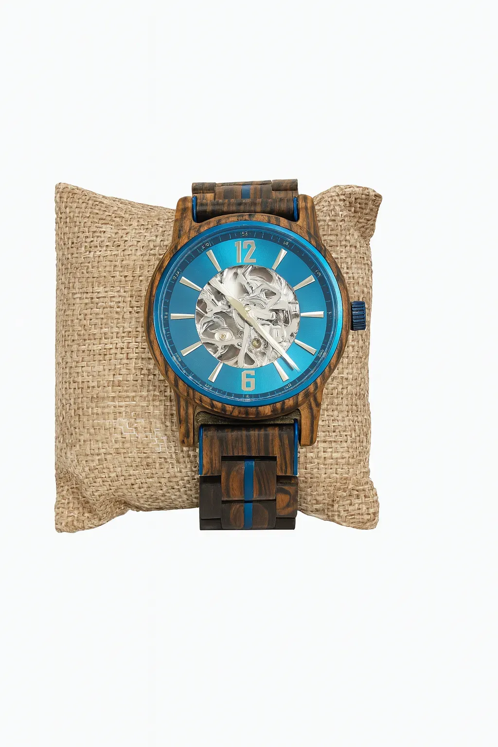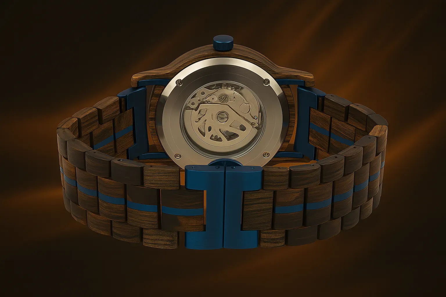 Rich snakewood with a bold teal skeleton dial — refined with polished steel accents and transparent detail.