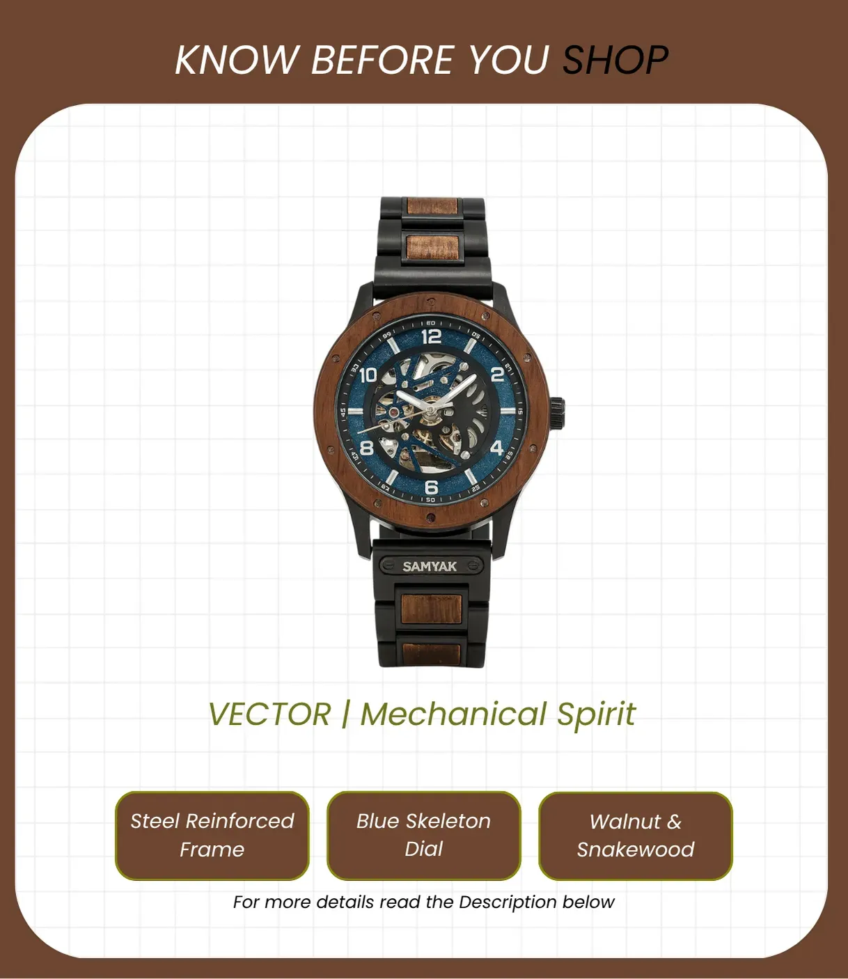 Vector features a bold blue skeleton dial framed by warm wood and black steel. With every gear in motion, it blends raw mechanics with refined design — a powerful symbol of strength, detail, and style.