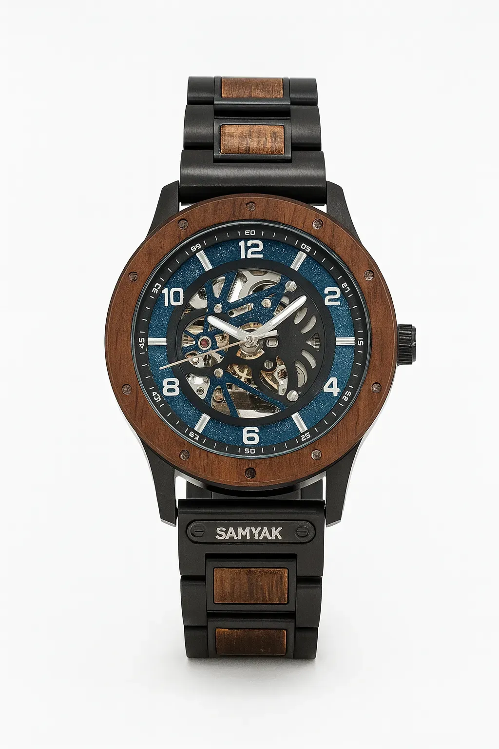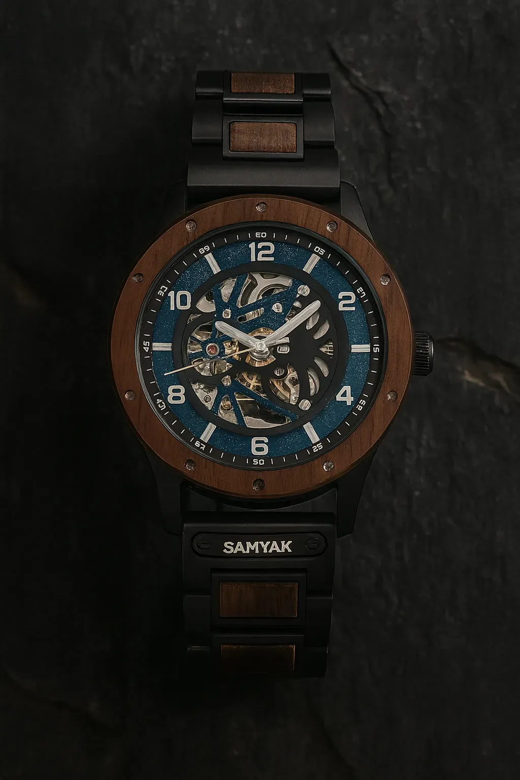 A bold blue skeleton dial framed by warm wood and black steel — blending raw mechanics with refined design.